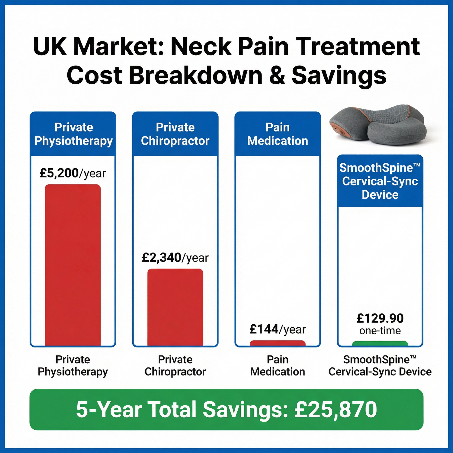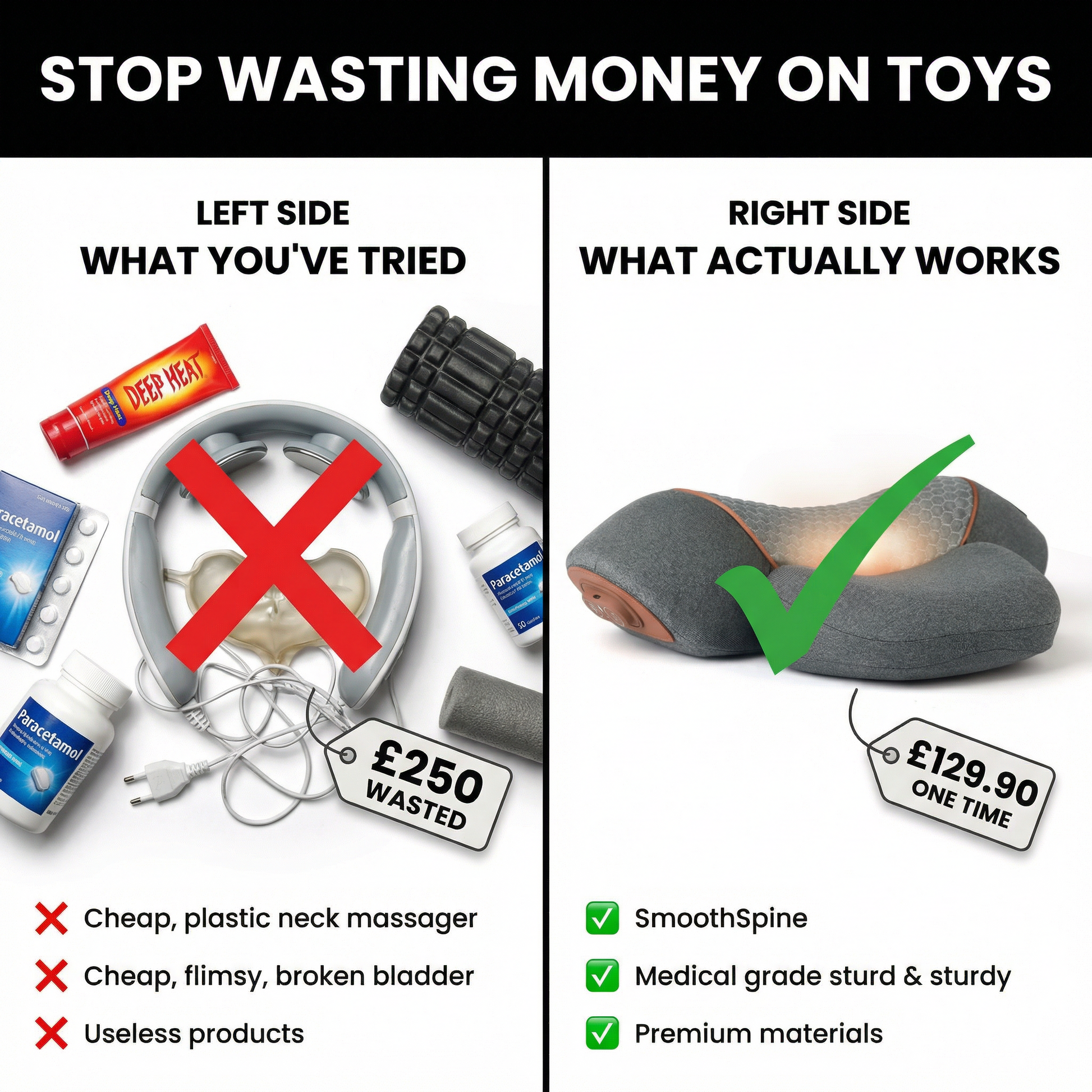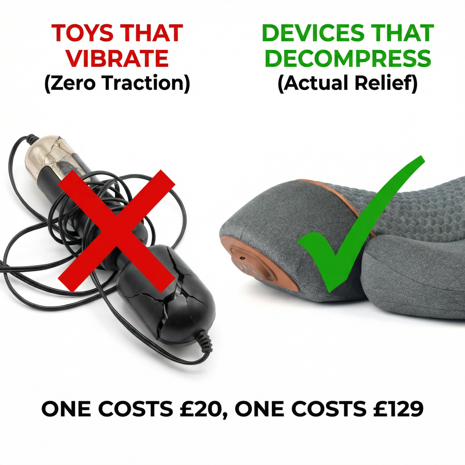 Vibrating massagers provide zero traction—they just activate sensory nerves that temporarily mask pain. No disc decompression, no vertebrae separation. SmoothSpine uses precise 26° cervical traction (the angle physiotherapists use) combined with therapeutic heat and acupressure. One is a £20 toy that breaks. One is a £129 medical device that actually works