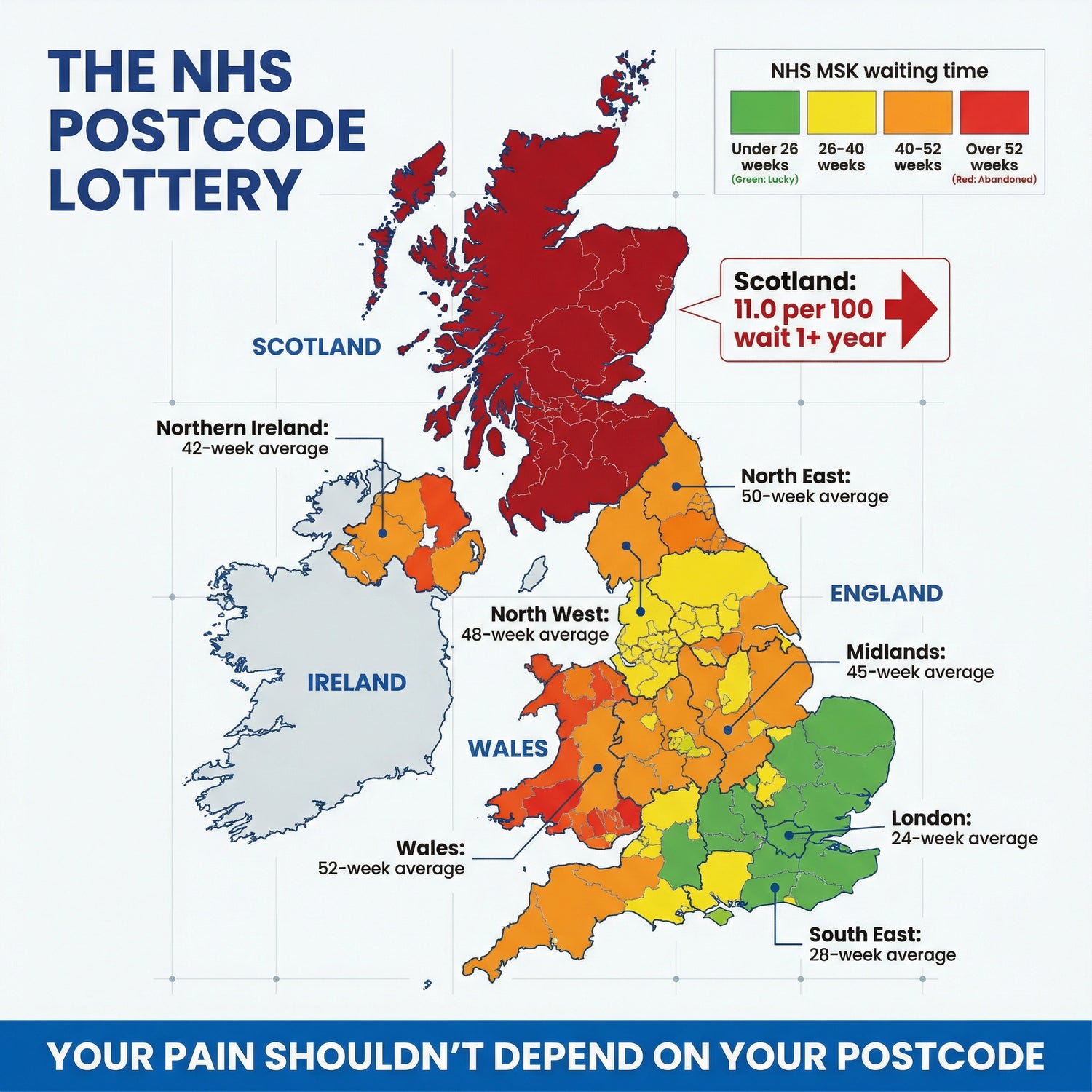 If you live in Scotland, your chance of waiting over a year for MSK treatment increased from 0.5 per 100 to 11.0 in just 8 years. In Wales, the average wait is 46-52 weeks—if you even get past the "8am phone lottery."